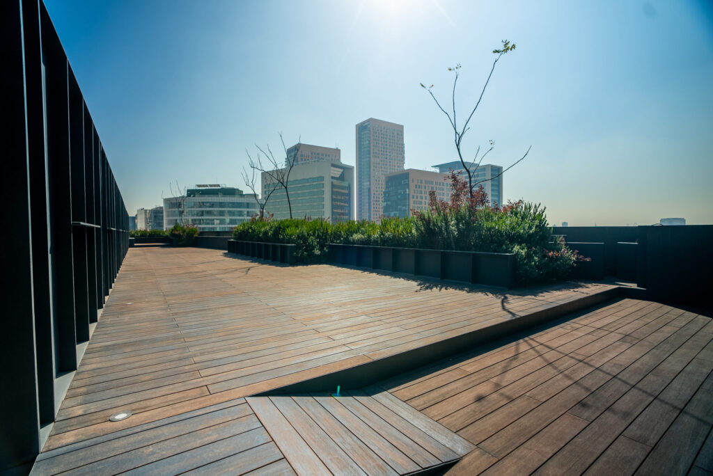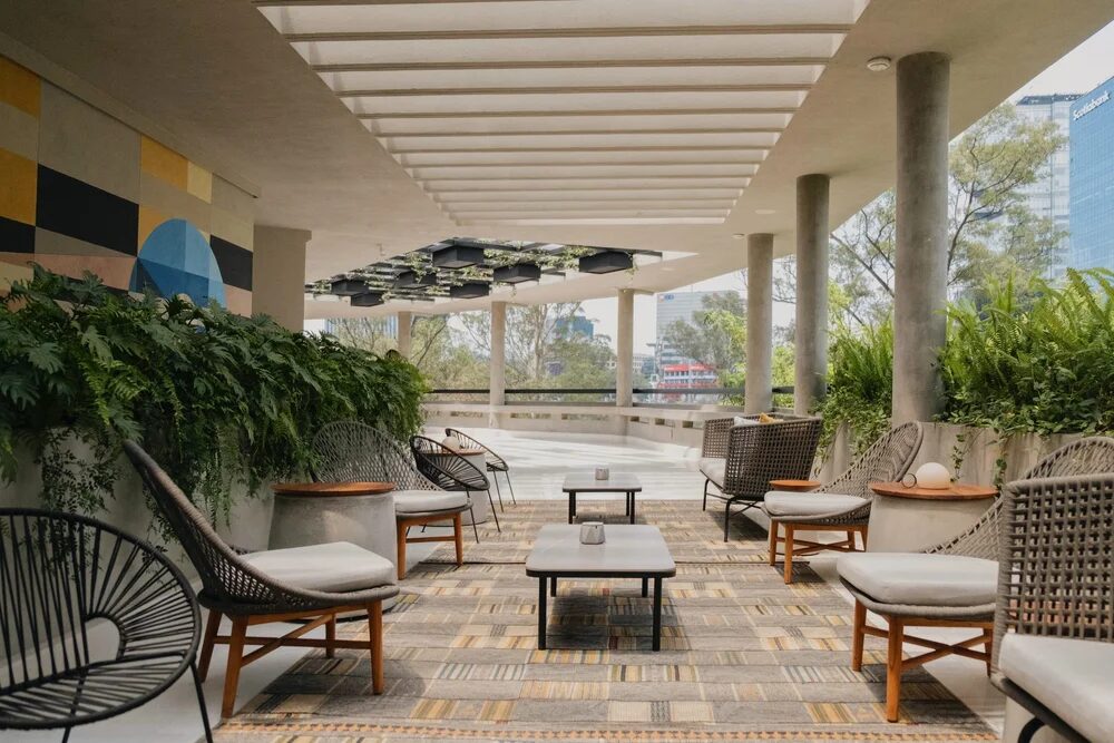Terraza contemporánea con vistas abiertas de la ciudad, perfecta para cócteles, activaciones de marca y encuentros sociales en un ambiente dinámico.